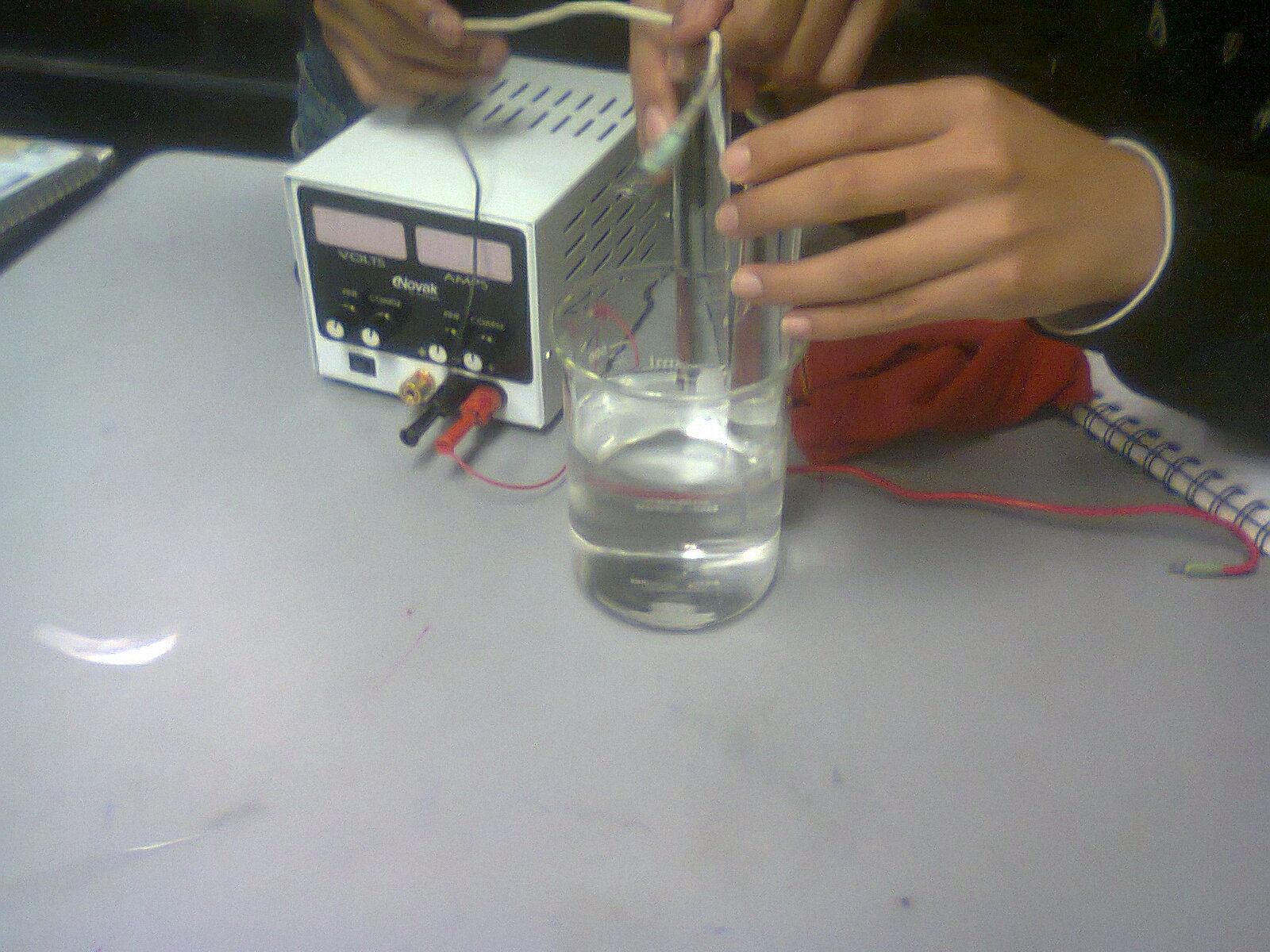 Material: Fuente de energía eléctrica, Vaso de precipitados 250 ml, agitador de vidrio, dos tubos de ensaye.